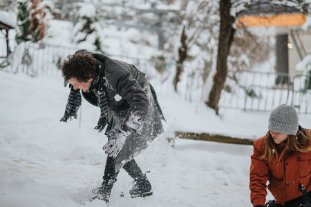 Enjoying a winter day with friends in a snowy park while playing and laughing