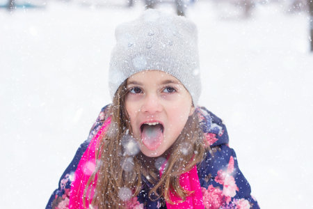 Little girl enjoys snow in amazing winter.