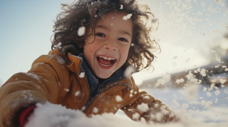 A young child enjoys a playful moment in the snow on a winter afternoon. They wear a warm hat and a coat, surrounded by falling snowflakes with a bright smile.