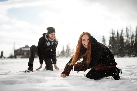 Playful redhead woman throwing snow on her man
