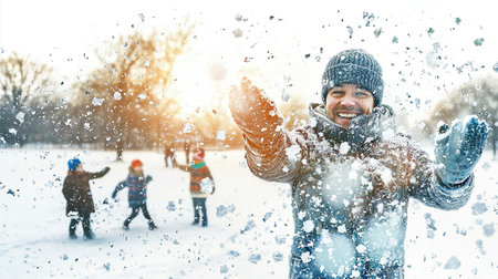 A joyful father and son share a playful snowball fight in a snowy winter wonderland Their laughter and smiles radiate warmth amidst the icy scenery, creating a heartwarming image perfect for holiday cards, winter activity promotions, and cherished family memories AI Generative