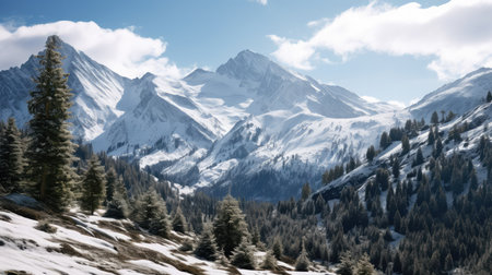 Panoramic view of snowy mountains and coniferous forest.