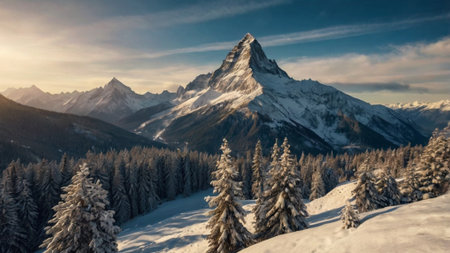Majestic mountain peak rises high above tranquil meadow in winter generated by artificial intelligence