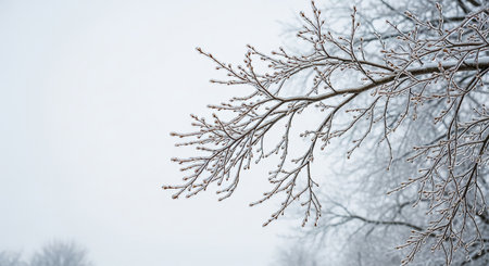 Thin tree branches are covered in a layer of clear ice, with visible buds on the tips, set against a pale,...