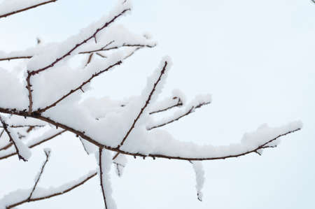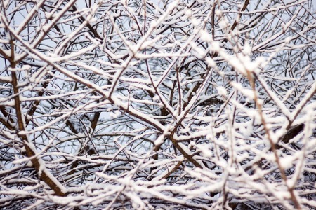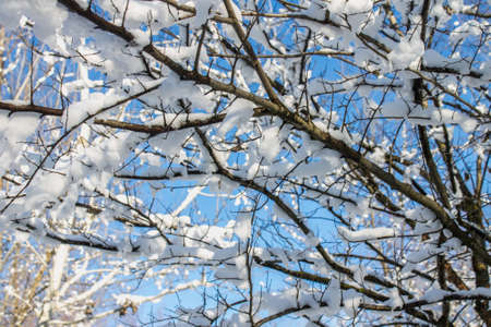 Tree branches covered in snow, winter abstract background