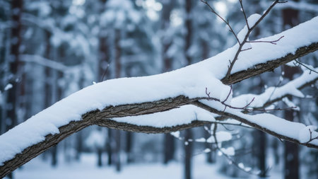 AI Generated. snow covered tree branch creates serene winter landscape