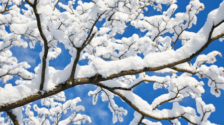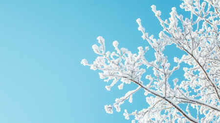 A serene winter landscape featuring snow-covered branches against a clear blue sky, perfect for seasonal or holiday designs