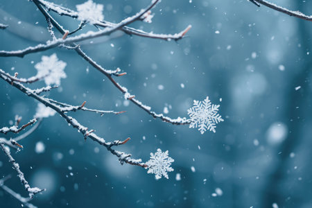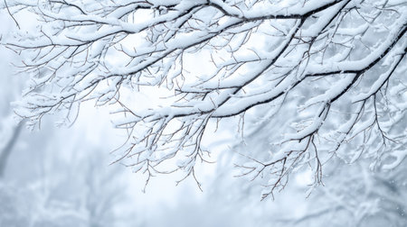 This image showcases frosted tree branches set against a diffused backdrop of falling snow. The composition highlights delicate textures, with a dominant cool color palette creating a wintry atmosphere. It might be used for seasonal themes, nature illustrations, or graphic design projects, suitable for various editorial and commercial applications.