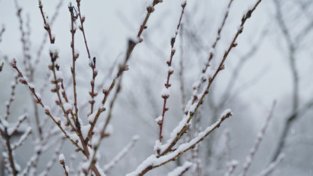 Apple tree blossom in garden under last early spring snow.Cold temperature,frost