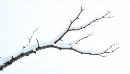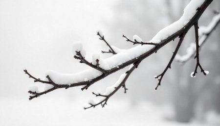 Snow-covered tree branches against a soft white background