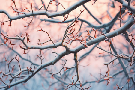 reddish glow on icy branches at dawn