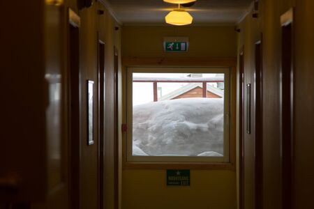 Snow-covered window of the hotel in Longyearbyen, Spitsbergen Svalbard. March, still a lot of snow.