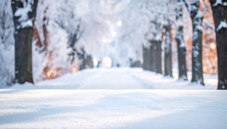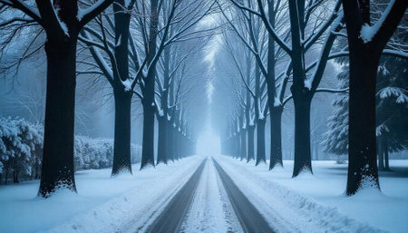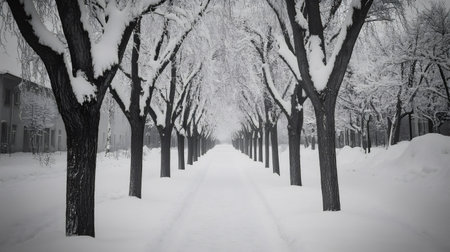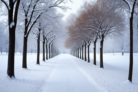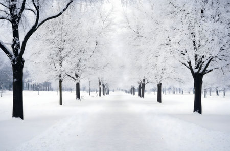 A snow-covered park alley with bare trees and a path stretches into the distance. Clear details and vibrant colors en...