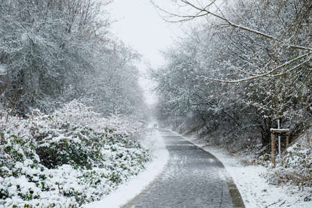 Footpath covered with snow in a park in winter, closeup of photo