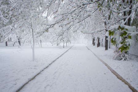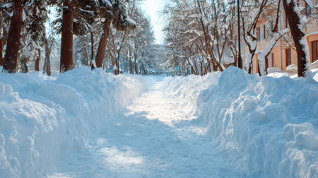 Serene Winter Pathway Amidst Fresh Snowfall in Urban Environment with Trees Lining the Sides Creating a Picturesque Scene of Winter Beauty