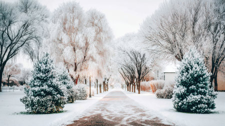 Serene winter scene with snow covered trees and a pathway leading through a frosty landscape
