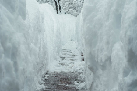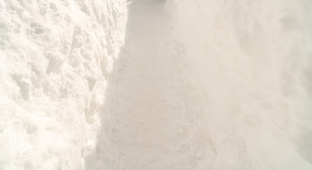 winter emergency: deep trench-trail in the snow, dug for the passage of people after heavy snowfall