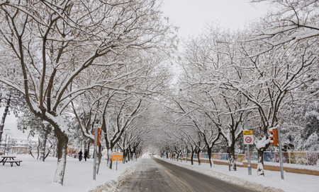 Road and tree covered by snow in winter,school way,school district