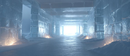 A long corridor in the dark with a lot of snow on it