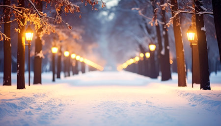 A snowy park alley at dusk is lit by warm street lamps creating a magical and serene atmosphere.