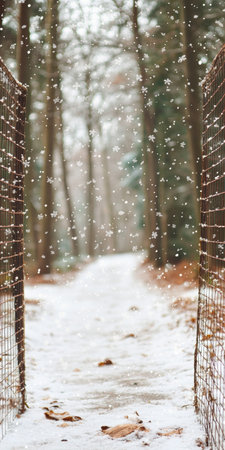 A snowy path winds through a frosty forest. Winter's magic fills the air.