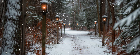 A snowy forest path lined with holiday lanterns and softly falling snow.