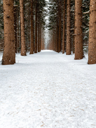 A long path winds through a snow-covered forest, flanked by tall trees. The scene is illuminated by soft, natural light, creating a tranquil atmosphere. The composition emphasizes perspective, leading the viewer's eye into the distance. This image is suitable for various commercial uses, including illustrations and backgrounds.