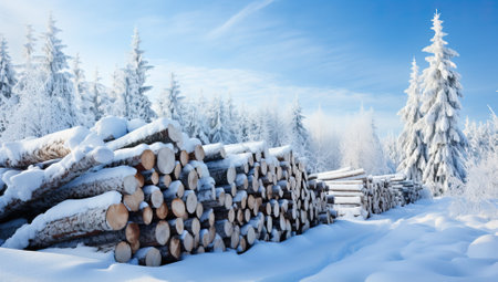 This image features freshly cut logs stacked in a serene snowy forest, capturing the tranquility of winter's embrace on nature. Ideal for seasonal themes.