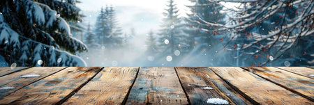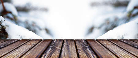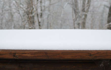 A wooden table boards and blurred defocused snow covered trees in the background.