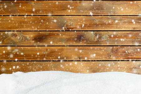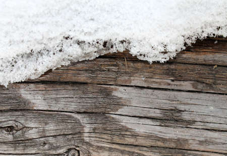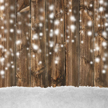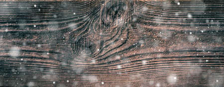 Winter wood. Christmas board with old rustic wall, white frozen snow. Winter wooden texture background. inimal flat lay