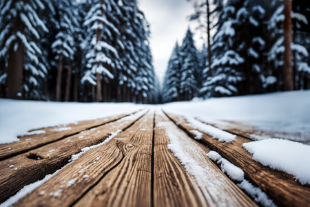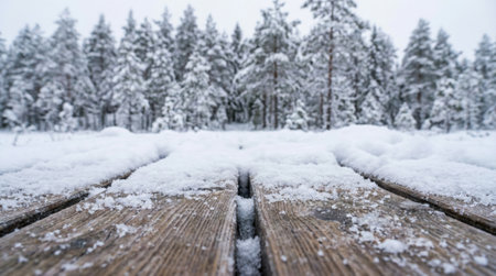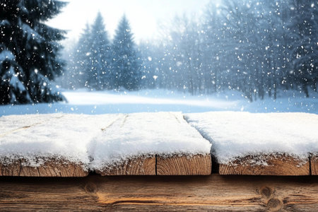 Close up of a snow-covered rustic wooden surface with a beautiful blurred background of a winter pine forest. Perfect for product placement or winter holiday themes.