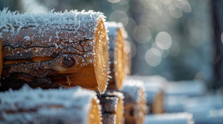 Frost-covered logs stacked in the winter forest, capturing the essence of cold and nature.