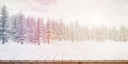 Beautiful winter scene. blurred background of snowy christmas nature background, Wood table top on shiny bokeh. For product display Christmas time mock up