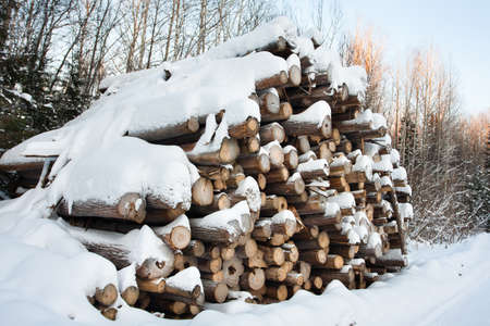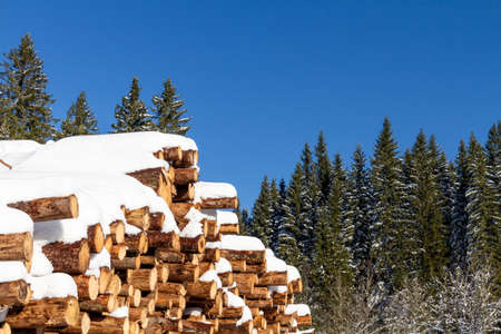 Forest pine trees log trunks felled by the logging timber industry covered with snow in winter
