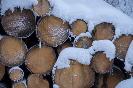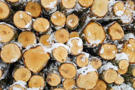 Deforestation. Lumber harvesting. Logs under snow. Stock of wood in forest. Winter snowdrifts
