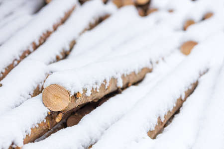 Stacked wood. Pile of small logs covered with snow. Tree trunks in forest during winter