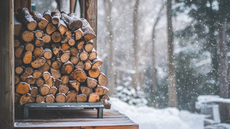 A captivating winter scene showcasing neatly stacked logs blanketed in snow against a blurred forest backdrop, creating a peaceful and tranquil atmosphere filled with falling snowflakes.
