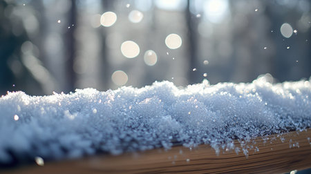 A close-up view of sparkling snow piled on a wooden railing, with a blurred snowy forest in the background