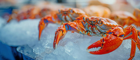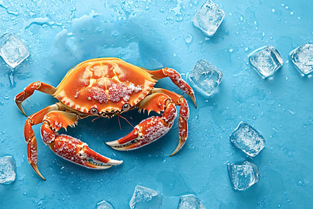 Fresh orange crab lying on melting ice cubes on a light blue background, creating a refreshing and appetizing seafood scene