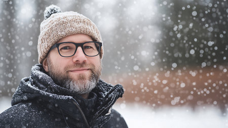 A man wearing a hat and glasses is smiling in the snow. Concept of warmth and happiness despite the cold weather