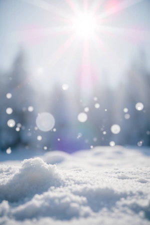 A beautiful winter scene featuring a snowy landscape with vibrant blue sky. Snowflakes dance in the air above sparkling white snow, creating a serene and magical atmosphere.
