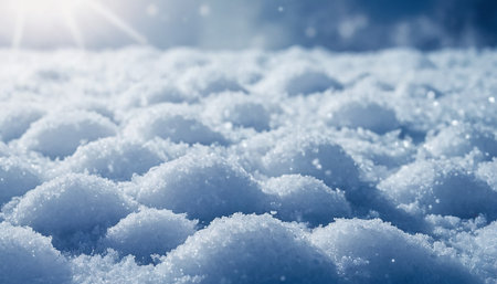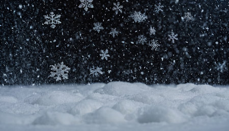 Glistening snowflakes gently fall on frosty surface, creating serene winter scene.