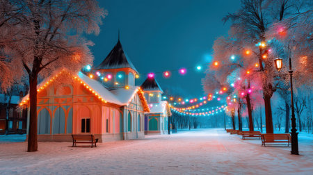 A serene winter park scene featuring colorful lights strung among snow-covered trees, creating a magical atmosphere at dusk with charming buildings and soft snow.