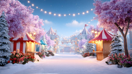 A captivating winter festival scene featuring colorful tents along a snowy pathway, adorned with blooming trees and twinkling lights, creating a magical atmosphere.