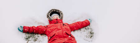 Cute adorable Caucasian girl child in warm clothes red jacket lying on snow ground during cold winter snowy day. Kids outdoor seasonal activity. Child making snow angel. Banner header for website.