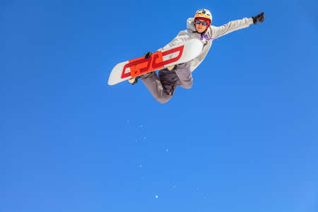Sochi, Russia - March 25, 2014: Man snowboarder flies in the air from jump on blue sky background