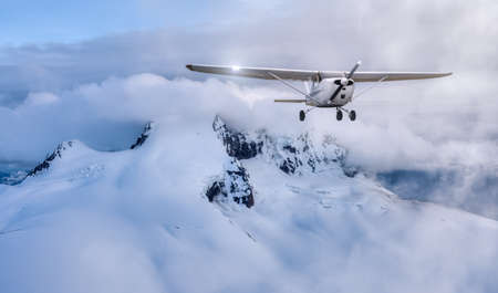 Airplane flying near the Beautiful Canadian Mountain Nature Landscape. Adventure Composite. Cloudy Sunset Sky. Background from near Squamish and Vancouver, British Columbia, Canada.