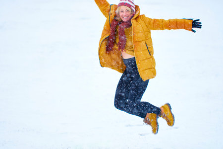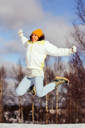 a woman in a good mood in winter on a walk., sunny day, jump up, spontaneity