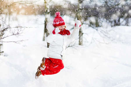Child playing with snow in winter. Little girl in colorful jacket and knitted hat catching snowflakes in winter park on Christmas. Kids play and jump in snowy forest. Children catch snow flakes