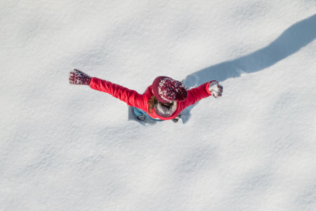 Happy woman, girl in a red winter jacket with spreading her arms standing on snow covered land . Aerial, top view, drone. Freedom, hope, peace concept